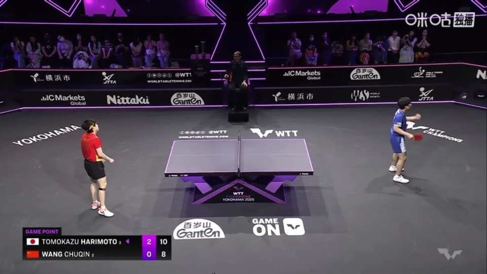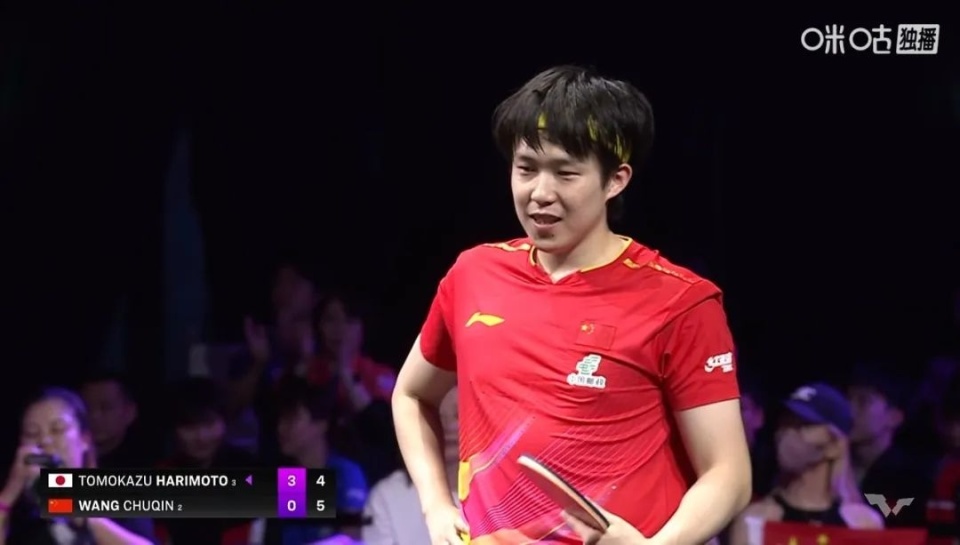 两人在第一局就打得难解难分,战至9比9后,张本智和连得2分后拿下。第二局,王楚钦欠缺了些许运气,5比11丢了第二局。第三局,张本智和状态出奇的好,11比8又胜一局。第4局,王楚钦退无可退,一度10比6取得局点,但被连追3分,于是立即叫了暂停。暂停回来,王楚钦一记漂亮的正手进攻,11比9扳回一局,大比分仍然1比3落后。